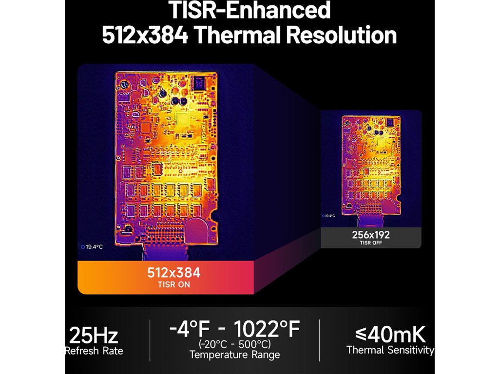 Díky technologii TISR je termální obraz vylepšen až na 512 × 384 px, což přináší ostřejší a přehlednější zobrazení. Kamera využívá duální snímání s 1,5MP kamerou ve viditelném spektru, funguje v režimu plug-and-play a je plně kompatibilní se zařízeními Android, iOS a Windows.