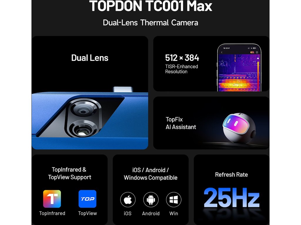 TOPDON termální infrakamera TC001 MaxTOPDON TC001 Max je moderní mobilní termální infra kamera vybavená AI asistentem a pokročilým zpracováním obrazu pro rychlou a přesnou diagnostiku. Pracuje s nativním infračerveným rozlišením 256 × 192 px, širokým teplotním rozsahem –20 °C až 550 °C a vysokou citlivostí, díky čemuž spolehlivě odhalí i drobné teplotní rozdíly.