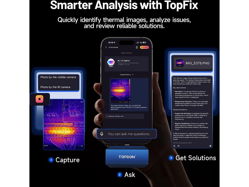 Největší „game-changer“ u TOPDON TC001 Max je AI termální asistent TopFix. Umí pracovat s vašimi termálními snímky, rozumí dotazům k naměřeným výsledkům a vrací okamžitá doporučení, aby bylo snazší z termografie rychle udělat praktický závěr (kde je problém, co zkontrolovat, jak pokračovat).
