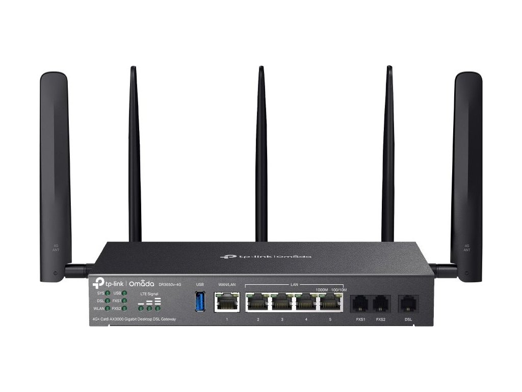 AX3000 Wi-Fi 6 DSL Gateway s rychlostí až 2402 Mb/s na 5 GHz a 574 Mb/s na 2,4 GHz, která poskytuje spolehlivé a vysokorychlostní připojení pro všechny domácí i kancelářské aplikace. Kombinace Super VDSL, kabelového internetu přes WAN a záložní mobilní 4G+ (Cat 6) (po připojení 4G USB donglu) zajišťuje nepřerušovaný přístup k internetu i při výpadku primární konektivity, což umožňuje hladké streamování, cloudové služby a plynulou videokonferenci.Porty a flexibilita připojení
