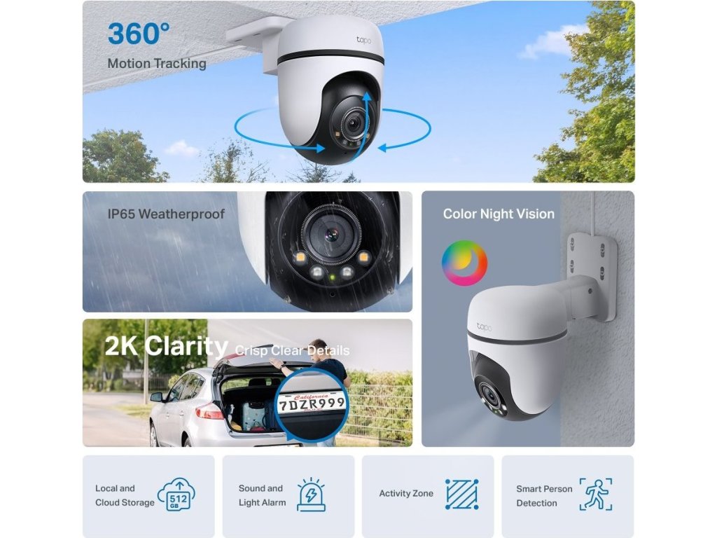 Tapo C510W IP kamera v provedení PTZ dome, disponuje 3 Mpx fixním objektivem (2304 × 1296, 15 fps) s fixní ohniskovou vzdáleností a snímačem 1/2.8". Nechybí ani slot na microSD karty do kapacity 512 GB, IR a bílé světlo na vzdálenost 30 m, mikrofon i reproduktor, krytí IP65 a integrovaná 2,4 GHz Wi-Fi s vestavěnými anténami.Kameru je možné napájet pouze prostřednictvím 12V DC zdroje, který je součástí balení.