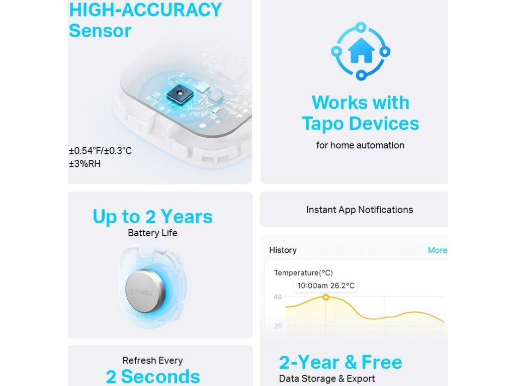 Rychlé a přesné monitorování - Detekuje teplotu a vlhkost pomocí vysoce přesného senzoru . Získávání a aktualizace dat každé 2 sekundy. (Přesnost: ±0,3 °C, ±3 % RH)Domácí automatizace - Automaticky zapíná/vypíná domácí elektroniku, když se nastavení dostane mimo své rozsahy.
