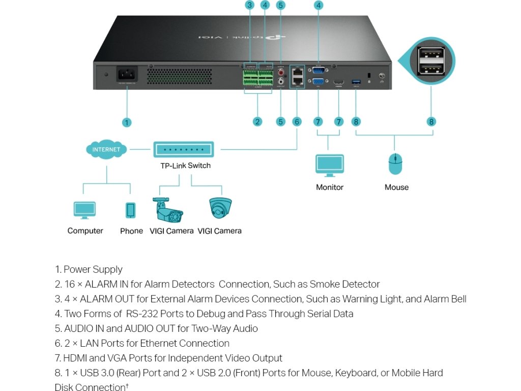 Vybavený různými porty, VIGI NVR4032H integruje 16× vstup pro alarm, 4× výstup pro alarm, dvoucestný zvuk, vstup pro video, nezávislý výstup pro video a další, což je vhodné pro malé a střední podniky a jejich potřeby v oblasti dohledu.