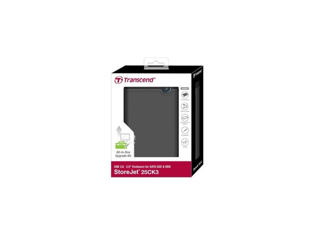 Transcend StoreJet 25CK3Přenosný USB 3.0 box StoreJet 25CK3 Upgrade Kit používá odolné gumové pouzdro na 2,5-palcový SATA disk. Neuvěřitelná SuperSpeed USB 3.0 rychlost přenosu.