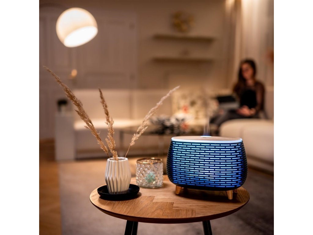 Terapie vůní i barvami vás uvolní, zklidní nebo třeba naopak nastartuje vaši produktivitu. Nádržku o objemu 400 ml stačí naplnit vodou pro zvlhčení vzduchu nebo přidat několik kapek esenciálního oleje a užívat si aromaterapeutických účinků. Ambientní osvětlení nabízí 7 barev nastavitelných v různých režimech, od statických barev po plynulé přechody mezi všemi barvami. Dokonale tak vyladíte atmosféru dle svých potřeb.