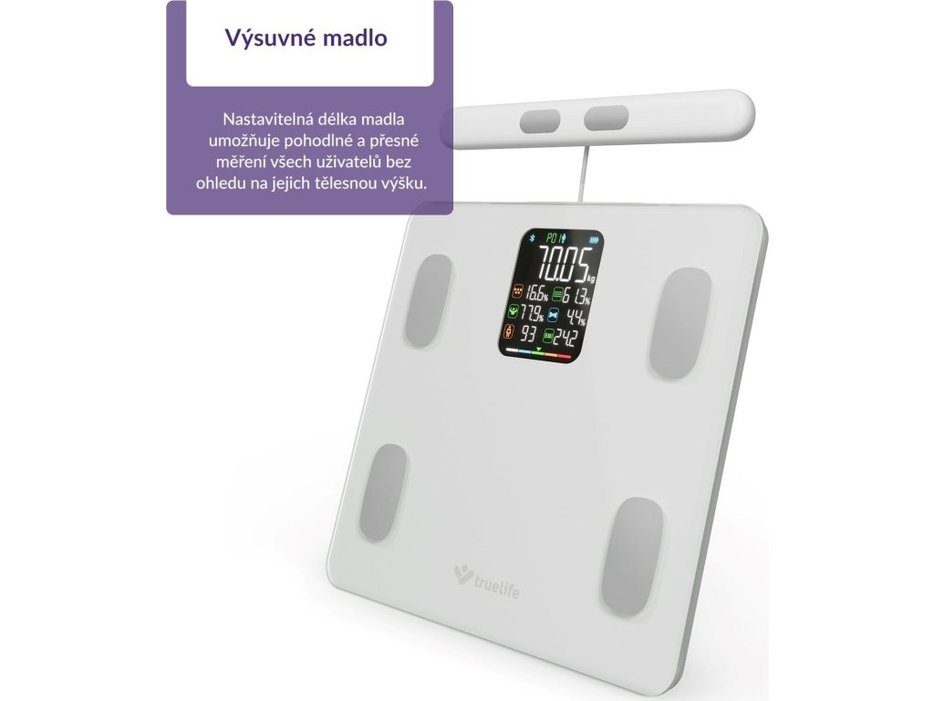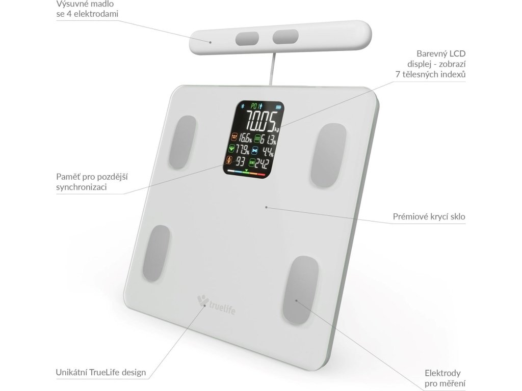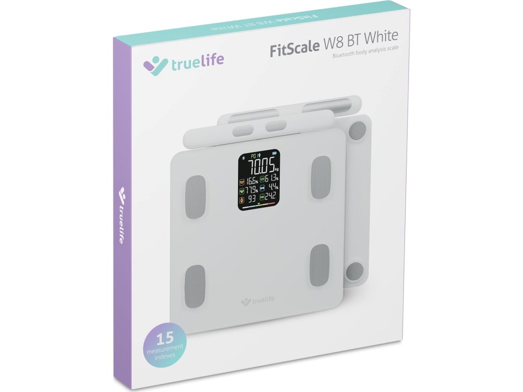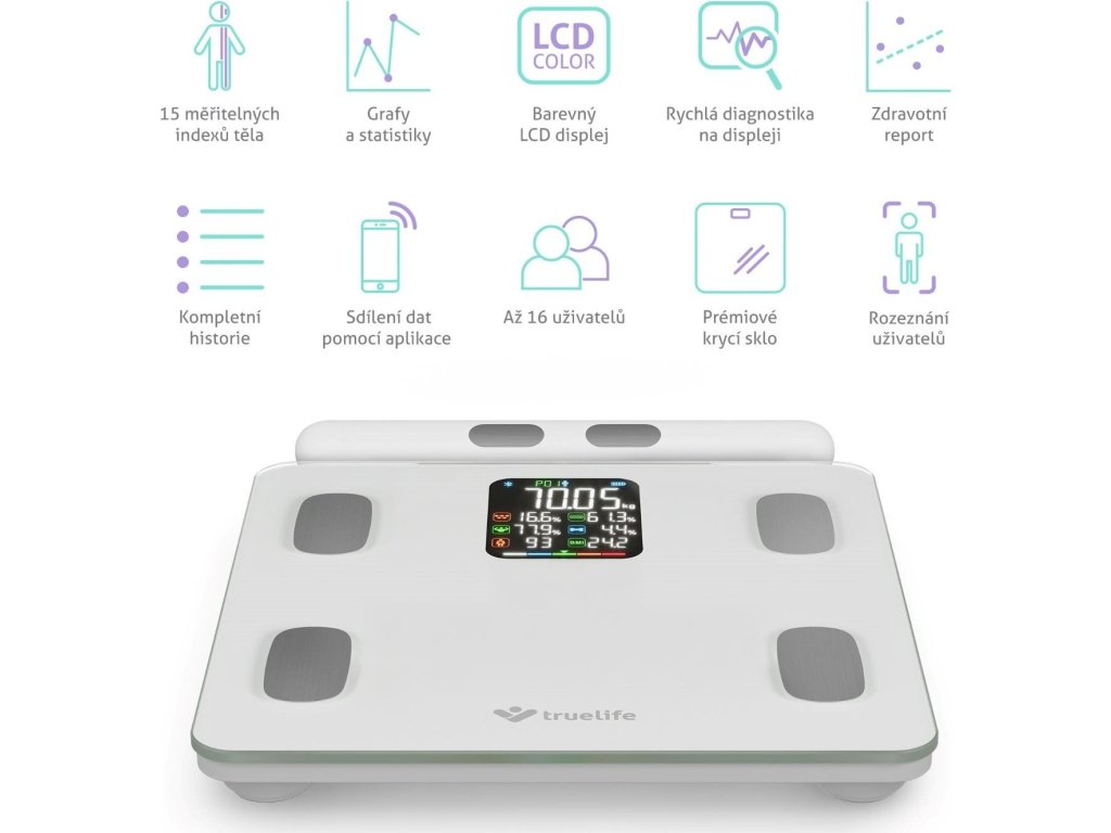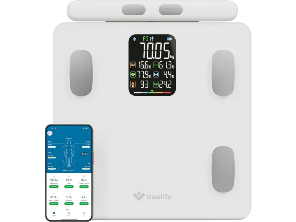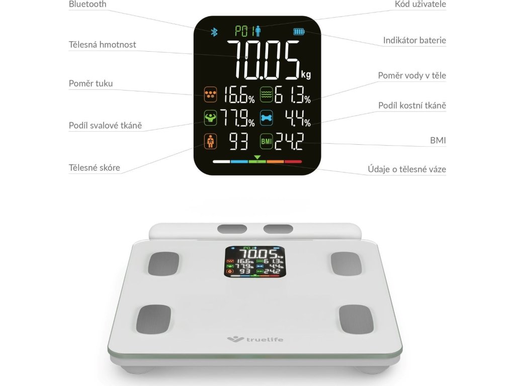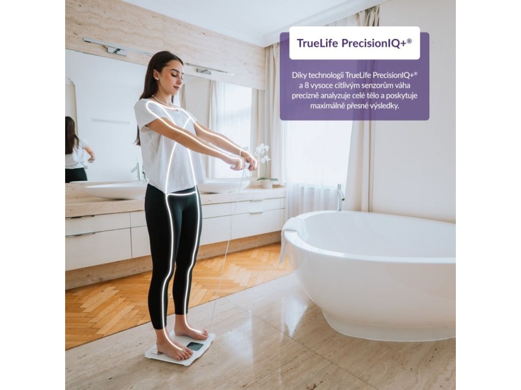 Rozumí vašemu tělu do detailuZjistěte o svém těle více než jen pouhou hmotnost. Každý jsme originál a jedinečnou skladbu má i naše tělo, proto o něm chytrá váha TrueLife FitScale W8 BT White prozradí detaily. Technologie TrueLife PrecisionIQ+® využívá 8 vysoce citlivých senzorů a s pomocí bioelektrické impedanční analýzy změří celkovou tělesnou kompozici. Na přehledném barevném LCD displeji zobrazí celkem 7 údajů - kromě hmotnosti také třeba procento tuku, svalů či vody. Propojením přes Bluetooth s aplikací získáte přehledný report zahrnující 15 tělesných indexů včetně jejich popisu. Váha je schopna sledovat až 16 uživatelů, u kterých v aplikaci zaznamená 15 posledních měření. Každého uživatele automaticky rozezná, takže není třeba nic přepínat. Kdokoliv má však možnost použít váhu i bez aplikace. Prémiové tvrzené krycí sklo je elegantní a velmi odolné s nosností až 180 kg. Při vážení si můžete zvolit jednotky, a to buď kilogramy nebo libry. Vážící odchylka činí pouhých 0,1 kg, takže vaše výsledky budou opravdu přesné.
