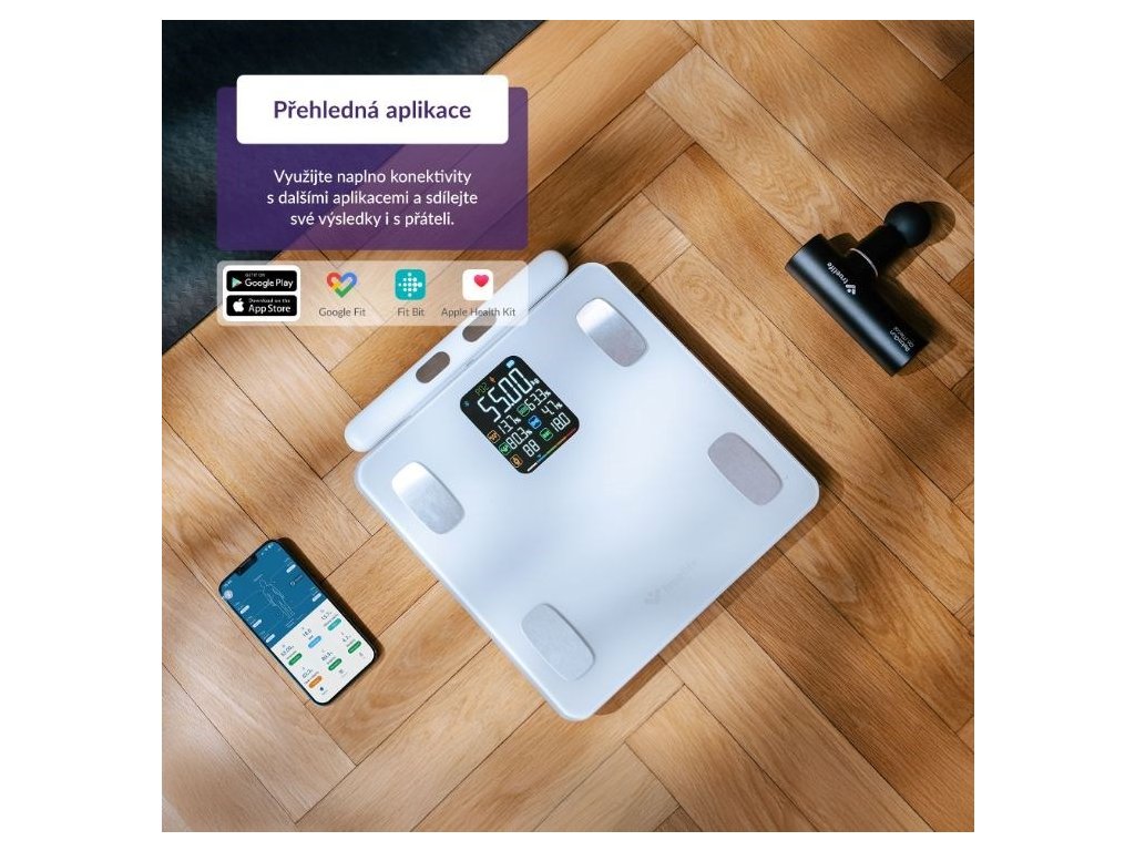 TrueLife FitScale W8 BT White pomocí Bluetooth snadno propojíte s aplikací, která je kompletně v češtině, přináší řadu výhod a rozšiřuje možnosti osobní váhy. Během vážení se údaje automaticky s aplikací synchronizují, a to až pro 16 uživatelů. Přehledný report pak nabízí 15 indexů těla s detailním vysvětlením a doporučením týkajícím se stravy a cvičení, jak postupovat k vytyčenému cíli. Z 15 posledních měření vytvoří aplikace i grafy a statistiky, aby byl vývoj zřetelnější. Data lze synchronizovat také s aplikacemi Moving life, Apple Health, Google Fit a Fitbit.