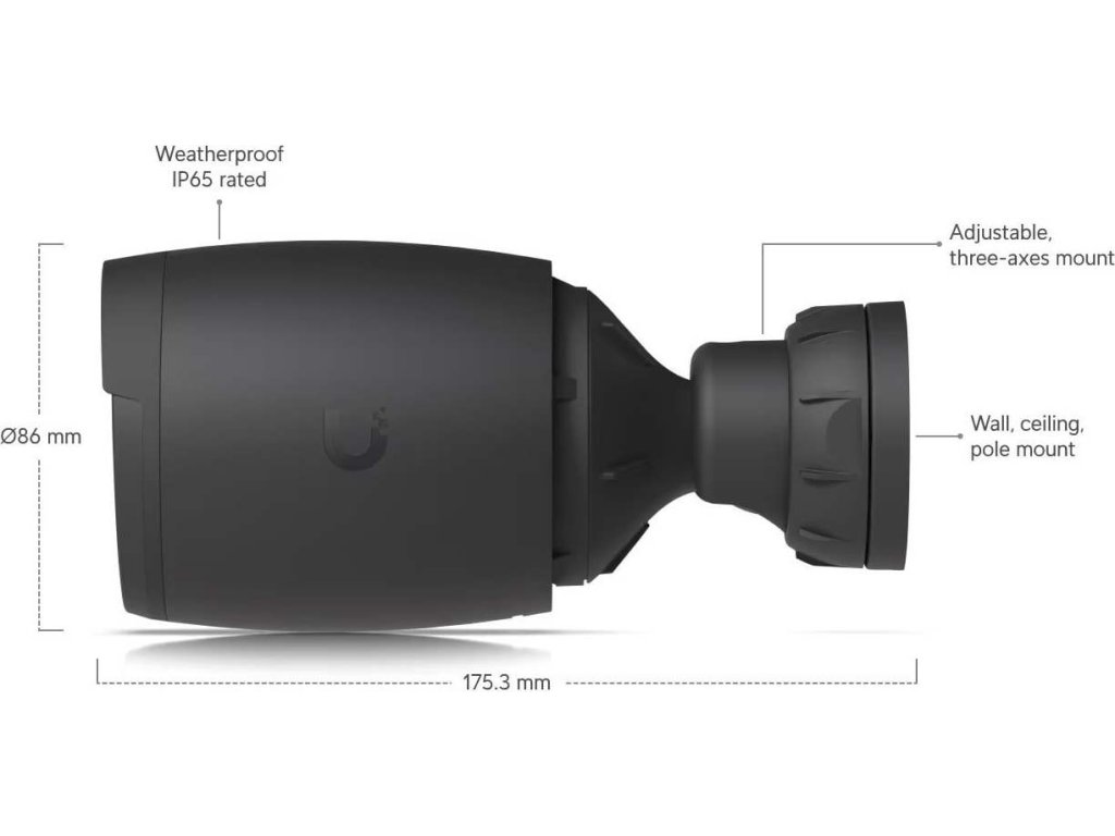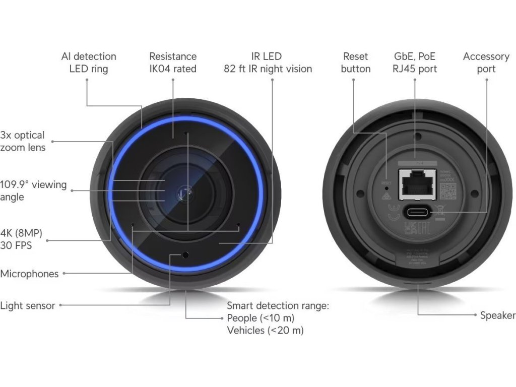 Bullet kamera AI Professional od Ubiquiti Networks je kamera s 8MP rozlišením (3840 x 2160px při 30 fps), opravdu velkým 1/1.8" senzorem, varifokálním objektivem 4.1 až 12.3mm, motorickým 3x optickým zoomem, pozorovacím úhlem 35 až 110°, integrovanými vysokovýkonnými infračervenými LED diodami pro noční vidění, mikrofonem, reproduktorem, stupněm krytí IP65 proti vodě a antivandal ochraně IK04. Kamera ke komunikaci směrem do sítě využívá Gigabitový LAN port s podporou napájení přes 802.3af PoE s maximální spotřebou 11W.UniFi Protect Software