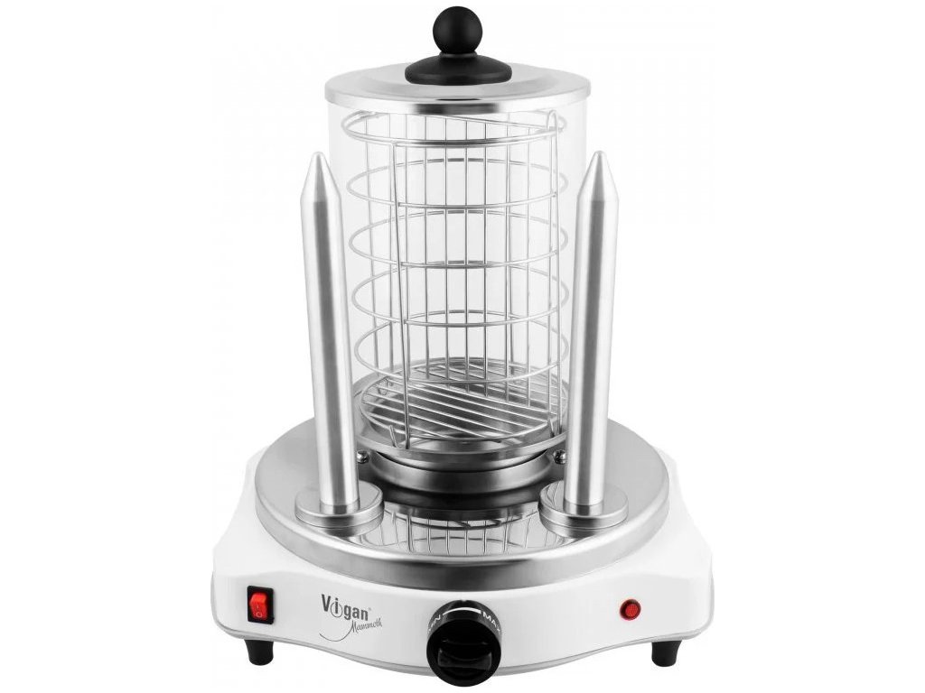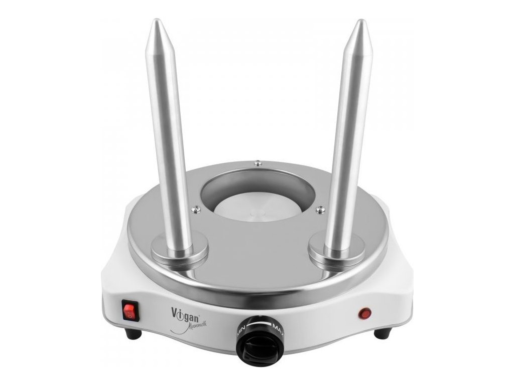 2 vertikální rozpékací hroty z leštěného hliníku pro ideální vedení tepla a přípravu dvou hotdogů najednou, průměr hrotu 2,2 cm, výška rozpékacích hrotů 20 cm s teplotou 170°C řízenou automatickým termostatem,