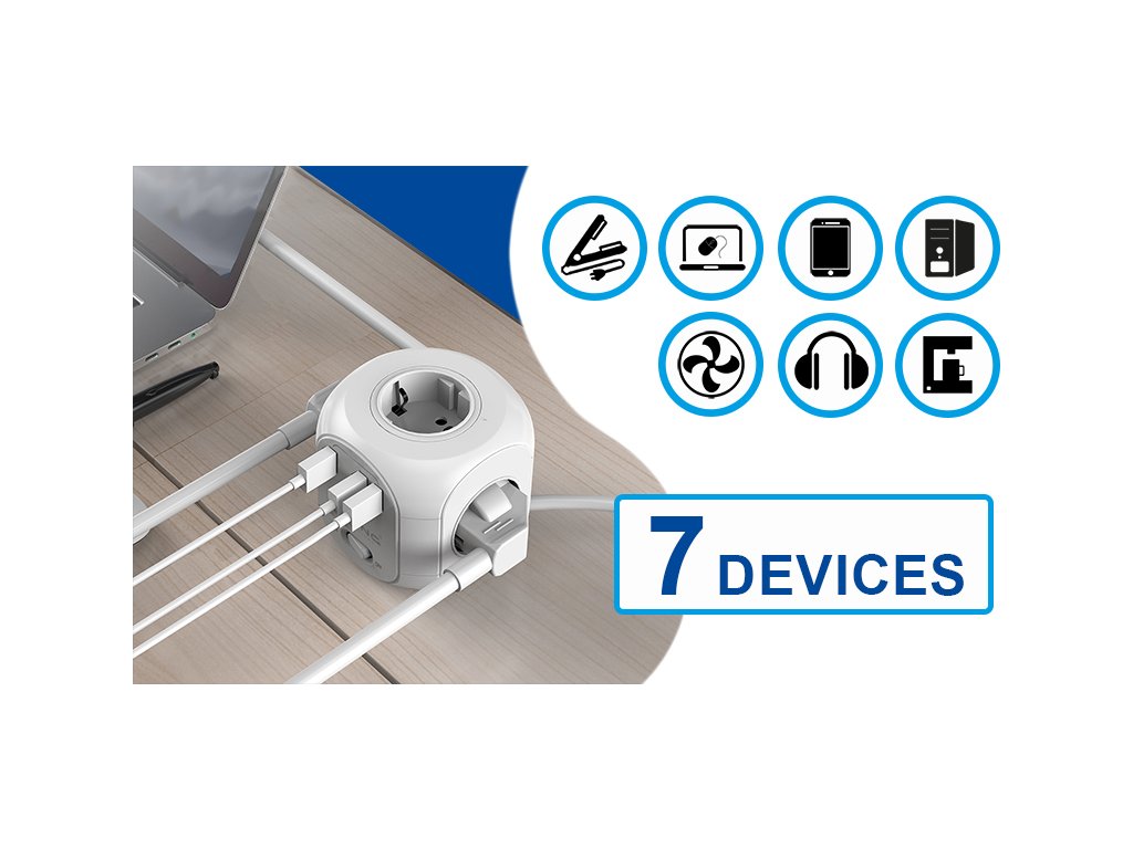 Se čtyřmi integrovanými AC 230V výstupy, dvěma rychlými USB-A výstupy a jedním výkonným USB-C výstupem s podporou rychlonabíjení PD a QC umožňuje AC Cube PD napájet a nabíjet současně až sedm zařízení. Už nikdy nebudete muset hledat volnou zásuvku nebo USB port.