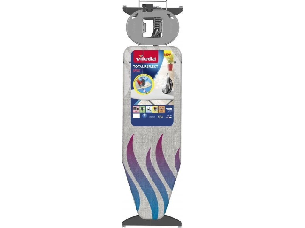 Vileda Total Reflect Plus s metalickým povrchem, který odráží páru a teplo a maximalizuje komfort během žehlení. Umožňuje Vám tak žehlit prádlo najednou místo z obou stran. Porovnejte jej s jinými žehlicími prkny a přesvědčte se sami, proč je toto prkno pro Vás lepší.Prodloužená záruka na 3 roky.