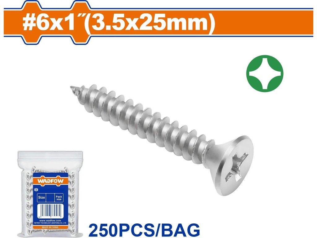 Balení obsahuje 250 ks samořezných šroubů se zápustnou hlavou o rozměru #6×1" (3,5×25 mm). Šrouby jsou vyrobeny z vysoce kvalitní uhlíkové oceli a disponují pozinkovanou povrchovou úpravou, která zajišťuje odolnost vůči korozi. Díky zápustné hlavě a pohonu typu Phillips jsou ideální pro pevné a estetické uchycení v různých materiálech, jako je dřevo, plast nebo tenčí kovy. Praktické balení v plastovém sáčku usnadňuje manipulaci i skladování.Klíčové vlastnosti: