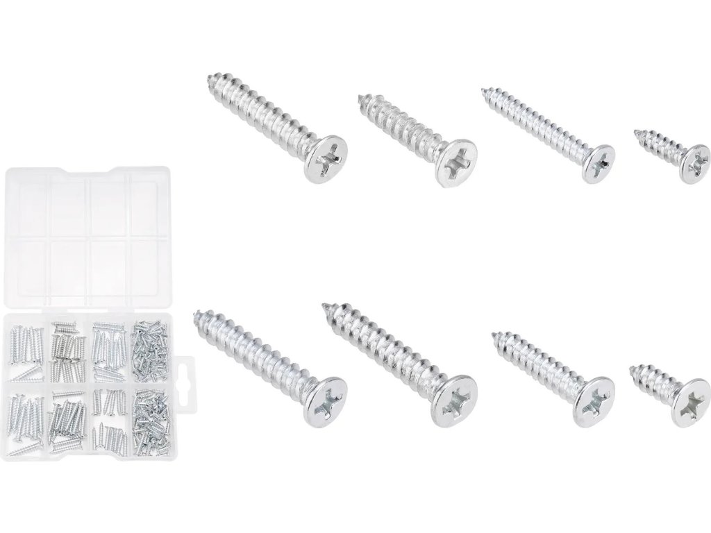 Sada obsahuje 200 ks samořezných šroubů se zápustnou hlavou, ideálních pro pevné a čisté spojení materiálů. Vyrobeny z uhlíkové oceli s pozinkovanou povrchovou úpravou pro zvýšenou odolnost proti korozi. Šrouby mají phillipsový pohon pro snadné a pevné šroubování. Sada zahrnuje různé velikosti pro široké použití v dílně i na stavbě.Klíčové vlastnosti:
