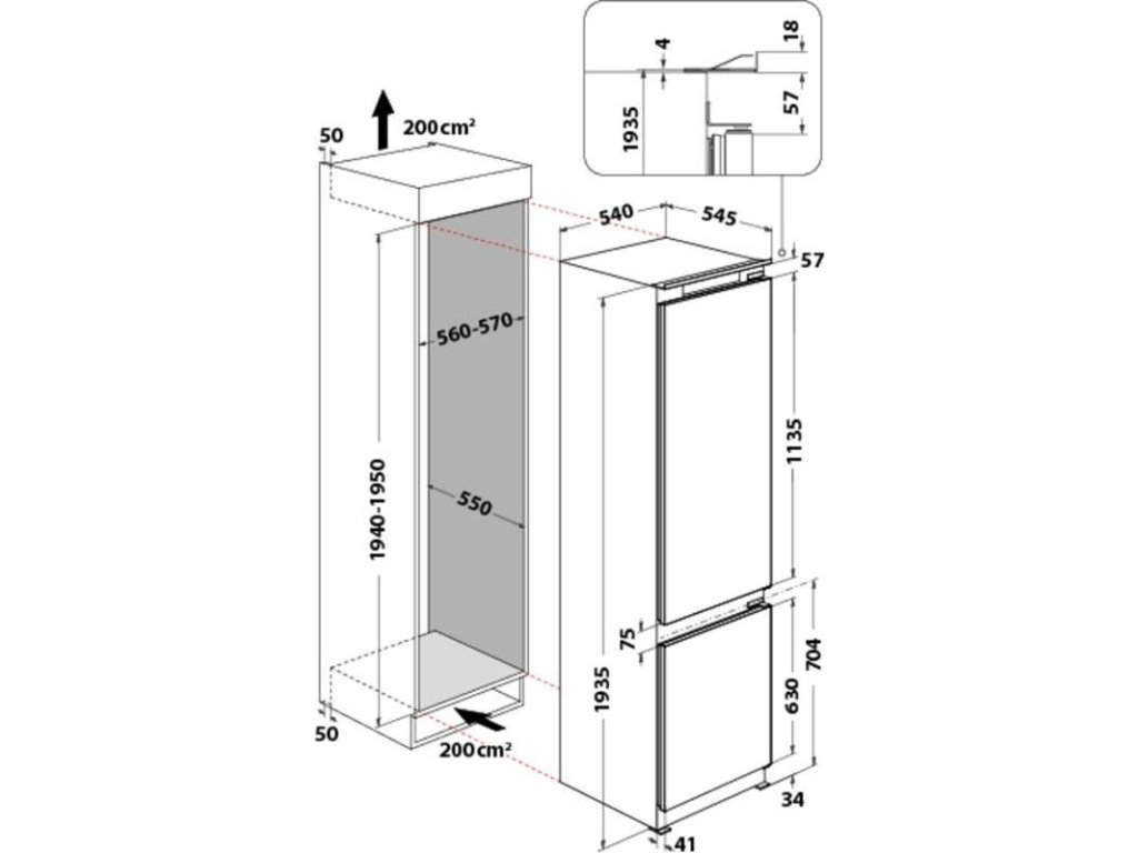 Vestavná chladnička disponuje přehledným plánkem s přesnými rozměry pro vestavbu. S rozměry 193,5 × 54 × 54,5 cm a hmotností 55,2 kg dokonale zapadne do vaší kuchyňské skříňky a stane se nedílnou součástí domácnosti.