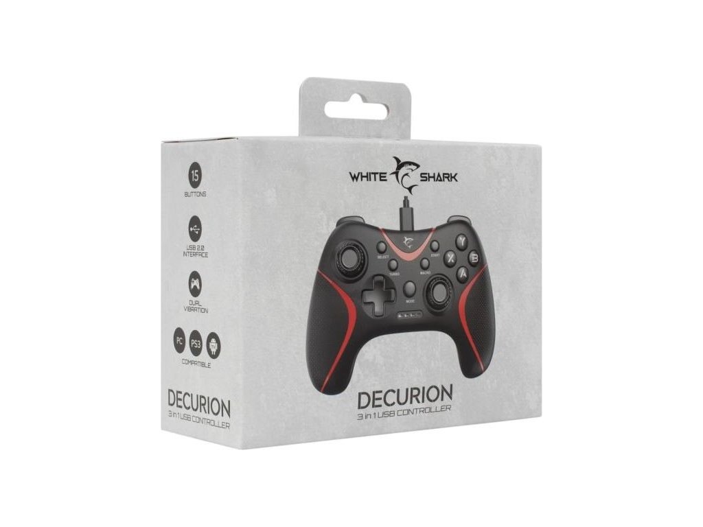 White Shark DECURION - gamepad pro spolehlivé hraní pro PC, PS3, kompatibilní se systémem Android, iOS, Windows 10.Gamepad White Shark DECURION je skvělý partner pro hraní her, pro PC a PS3, kompatibilní se systémem Android, iOS, Windows 10 s kabelovým připojením.