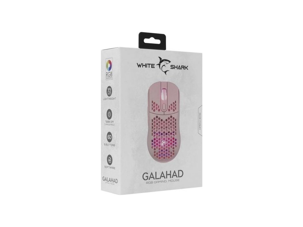 White Shark herní myš GM-5007 GALAHAD, čipset INSTANT 825, rozlišení 7200 DPI, s voštinovým designem, pogumovaným povrchem a ergonomickým designem, RGB osvětlení s 16,8 M barvamiPod voštinovou kapotou myši Galahad se nachází kvalitní čipset INSTANT 825 s rozlišením 7200 DPI.