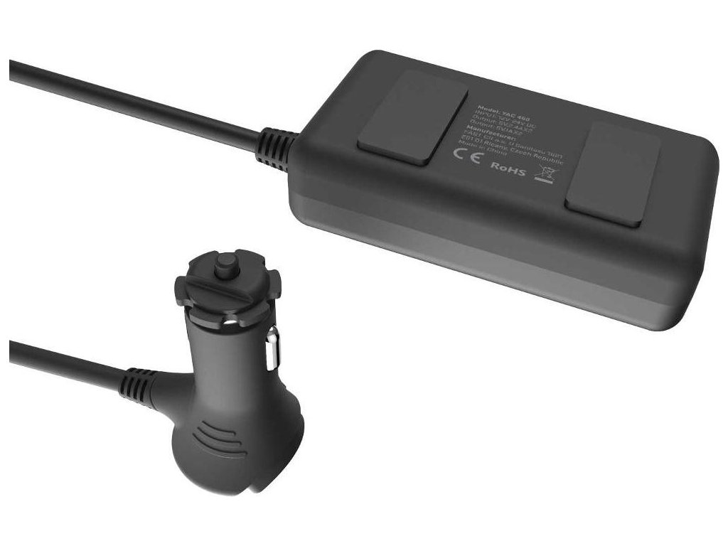 ovládající USB a 12V výstupní konekory. Nabíjecí stanice disponuje vícenásobnou ochranou jakou je např. ochrana vůči zkratu, přetížení, přehřátí a přebití. Stanice je dále vybacena 8 A jednorázovou pojistkou.