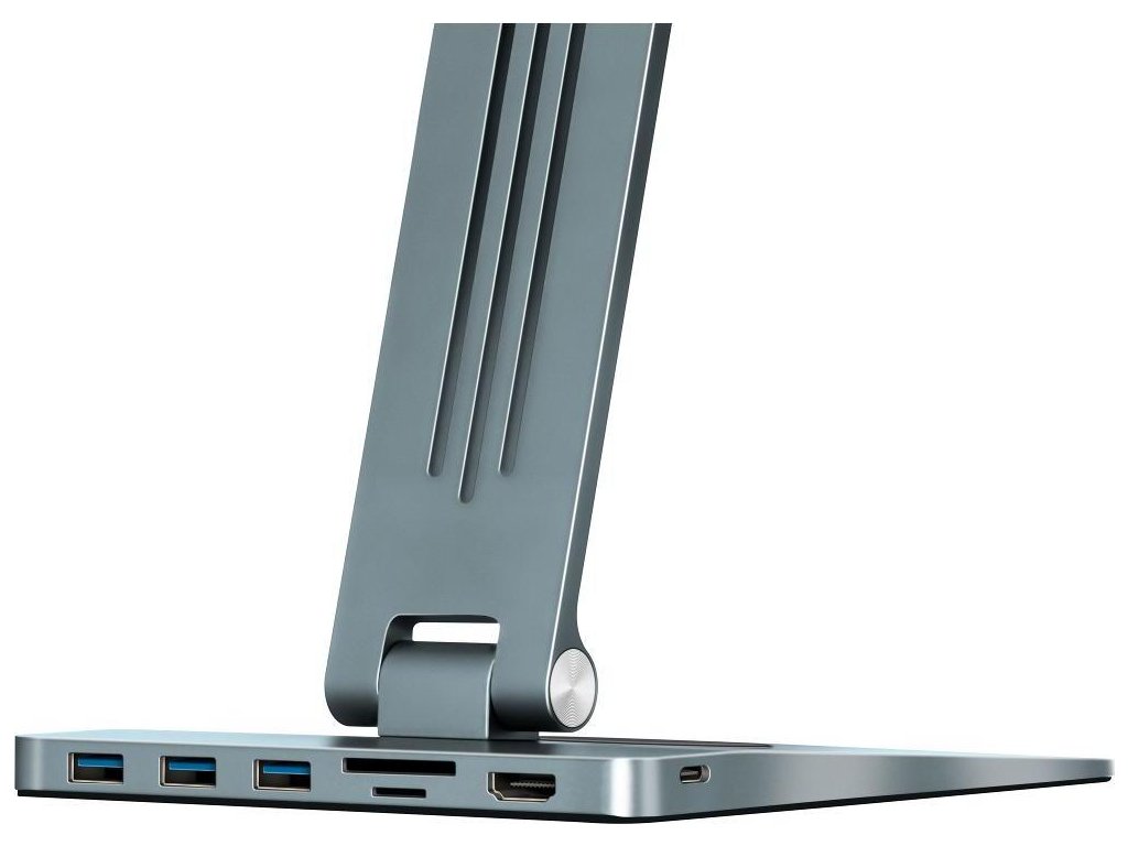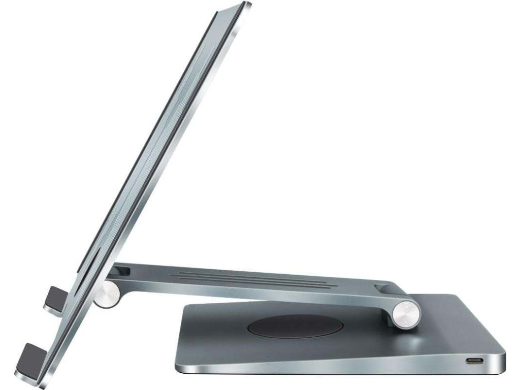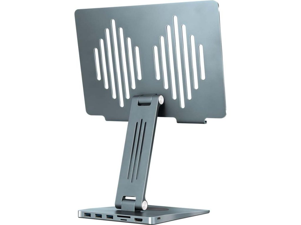Univerzální polohovatelný stojan kompatibilní se zařízeními do velikosti 15,6" nabízí výkonné výstupní porty typu USB C (PD 100W) nebo USB A 3.0. Kromě toho je vybaven HDMI 2.0 portem pro připojení dalšího monitoru a sloty pro SD a Micro SD karty pro snadnou práci s daty a fotografiemi. S možností rotace o 360 stupňů a polohování poskytuje neomezenou flexibilitu. Tři USB 3.0 porty umožňují rychlý přenos dat s maximální rychlostí až 5Gbps. K dispozici je také výkonný USB C 3.1 (Gen.1) port s podporou Power Delivery 3.0, který nabízí až 100W výstupního výkonu pro vaše zařízení. Stojan také obsahuje bezdrátovou nabíjecí plochu s maximálním výstupním výkonem 15W pro nabíjení mobilních telefonů nebo bezdrátových sluchátek, jako jsou AirPods. Plocha je vybavena silikonovou podložkou na spodní části stojanu. S podporou rozlišení FHD1080p 120Hz a UHD 3840 x 2160@30Hz nebo 4096x2160@60Hz na HDMI výstupu získáte kvalitní obraz na vašem televizoru, monitoru nebo projektoru přímo z vašeho přenosného zařízení. Vestavěné sloty pro paměťové karty Micro SD a SD s rychlostí přenosu dat až 5Gbps umožňují snadný přístup ke souborům a fotografiím bez potřeby dalších adaptérů nebo čteček karet. Stojan je vyroben z odolných prémiových materiálů, jako je hliník a silikon, a s hmotností 880g a rozměry 240x163x228.9mm je ideální pro použití v kanceláři, doma nebo na cestách. Lze ho také snadno složit do vodorovné polohy pro přenos v batohu nebo cestovní tašce. Díky svému designu perfektně odpovídá vašemu zařízení a poskytuje optimální zážitek při práci, hraní her nebo sledování videí. Je kompatibilní s tablety nebo notebooky do velikosti 15,6".