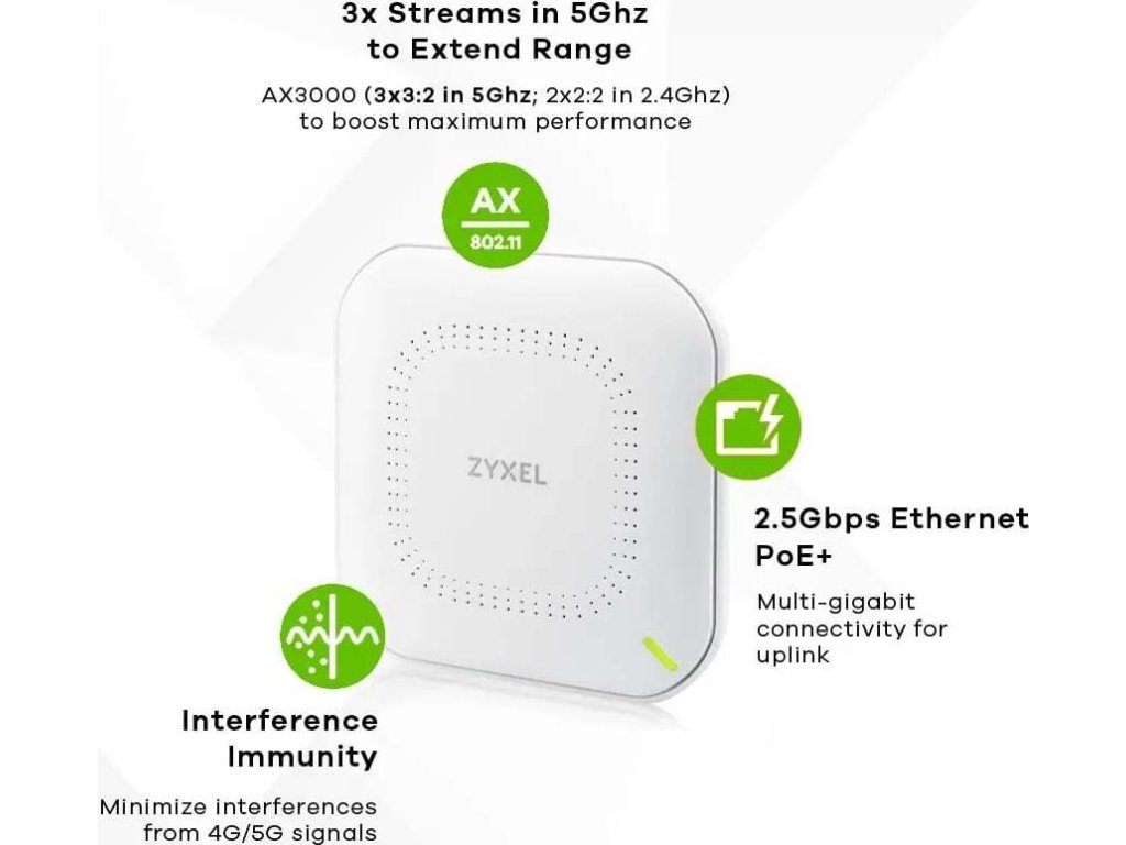 Přístupový bod ZyXEL NWA50AX Pro s 2,5gigabitovým ethernetovým uplink portem je primárně určen malým firmám a domácím kancelářím a poskytuje vysoce výkonnou Wi-Fi s rychlostí až 2975 Mbps.